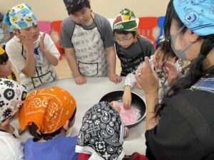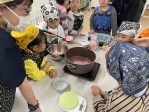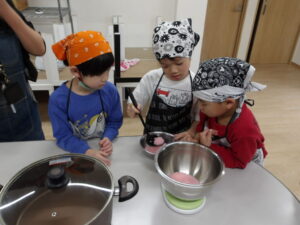みんなで計った道明寺粉を水と一緒に火にかけていきます!